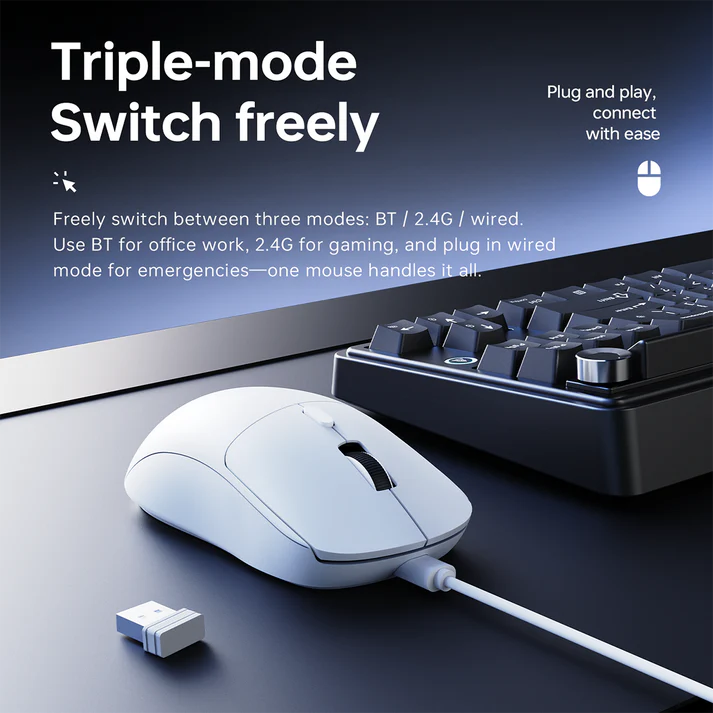 One of the standout features of the AJAZZ NJ07 is its tri-mode connection system. Users can switch easily between 2.4GHz wireless, Bluetooth, and wired USB-C modes, making the mouse compatible with multiple devices.