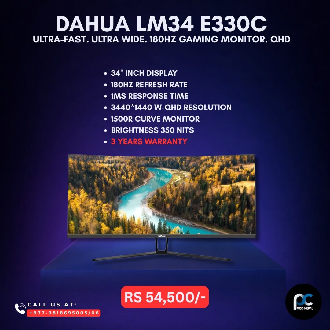 The Dahua LM34-E330C is one of the best ultrawide gaming monitors in Nepal, offering competitive-level performance with immersive curved design. Ideal for: