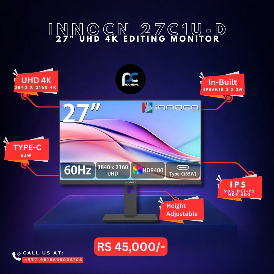 Now available in Nepal at an attractive price of Rs. 45,000, the INNOCN 27C1U-D is the perfect 4K monitor for creators, office professionals, and productivity enthusiasts.